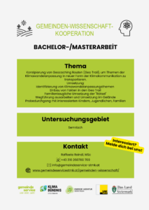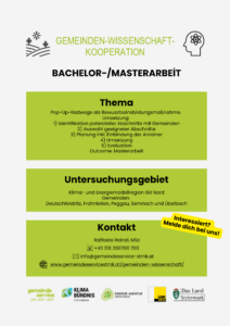 Die Gemeinde sucht aktiv innerhalb der Themen Energie und Klima nach Studierenden, die eine bestimmte, zeitlich begrenzte, innovative und wissenschaftlich relevante Aufgabenstellung behandeln können. Eine ausgewählte Person dient als Ansprechperson für die Universität bzw. für Studierende und betreut die Studienarbeit.